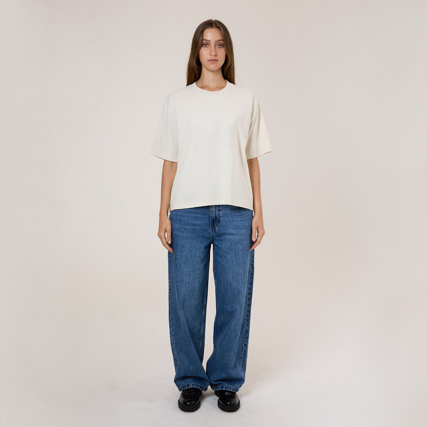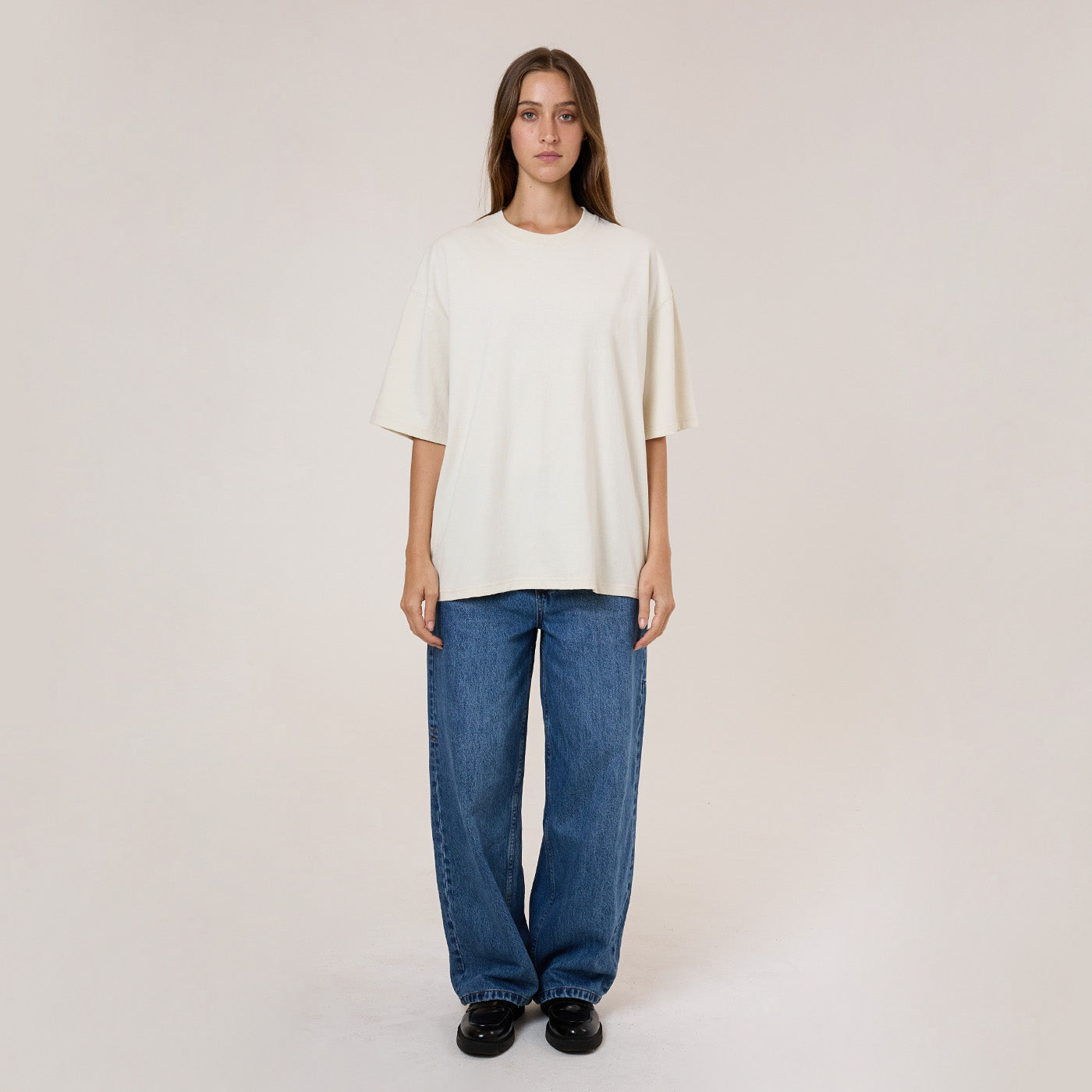 Oversized fit with a crew neck. The oversized tee is shorter and wider than the merch tee.