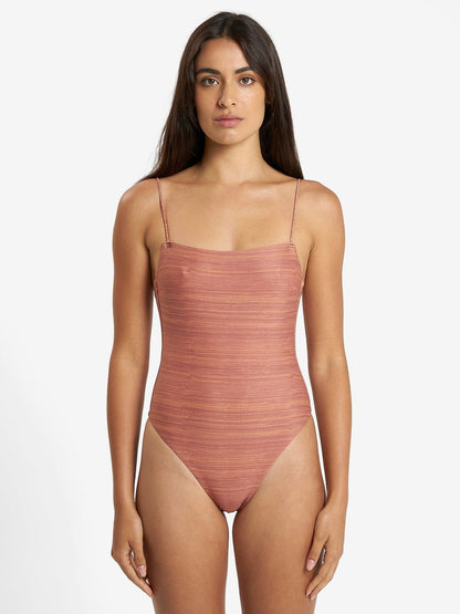 Giving swimwear basics an elevated take, our Elixer Linear One Piece in Sundown is a blend of style . It is made from recycled nylon with elastane giving you the perfect stretch to flatter and accentuate your figure. Delicate spag straps add allure while the modest bikini cut keeps you comfy in and out of the water.