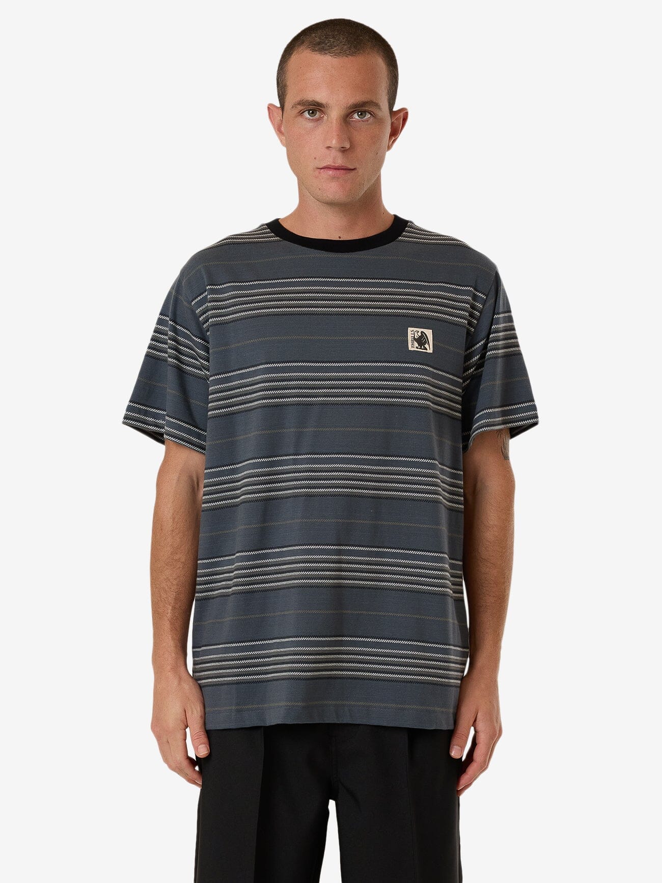 A fusion of street appeal and superior FABRIC, our Heavy Times Stripe Merch Fit Tee in Light Petrol is ready to take your summer style to the next level. It features a relaxed, roomy fit with contrasting crewneck and a versatile stripe design. Pair with denim jeans or pants to suit any summer event.
