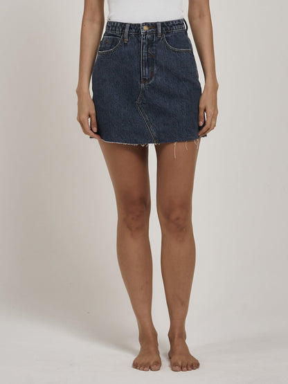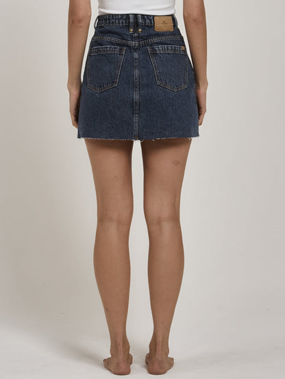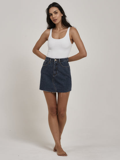 The Leni skirt is a classic longer line A-line skirt in our new Worn In Blue colourway, now available in 100% Organic Cotton. The Leni Skirt is high-waisted, with a mid-thigh length and a raw hem.