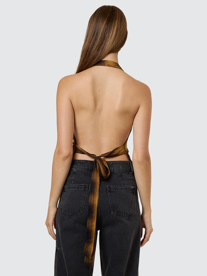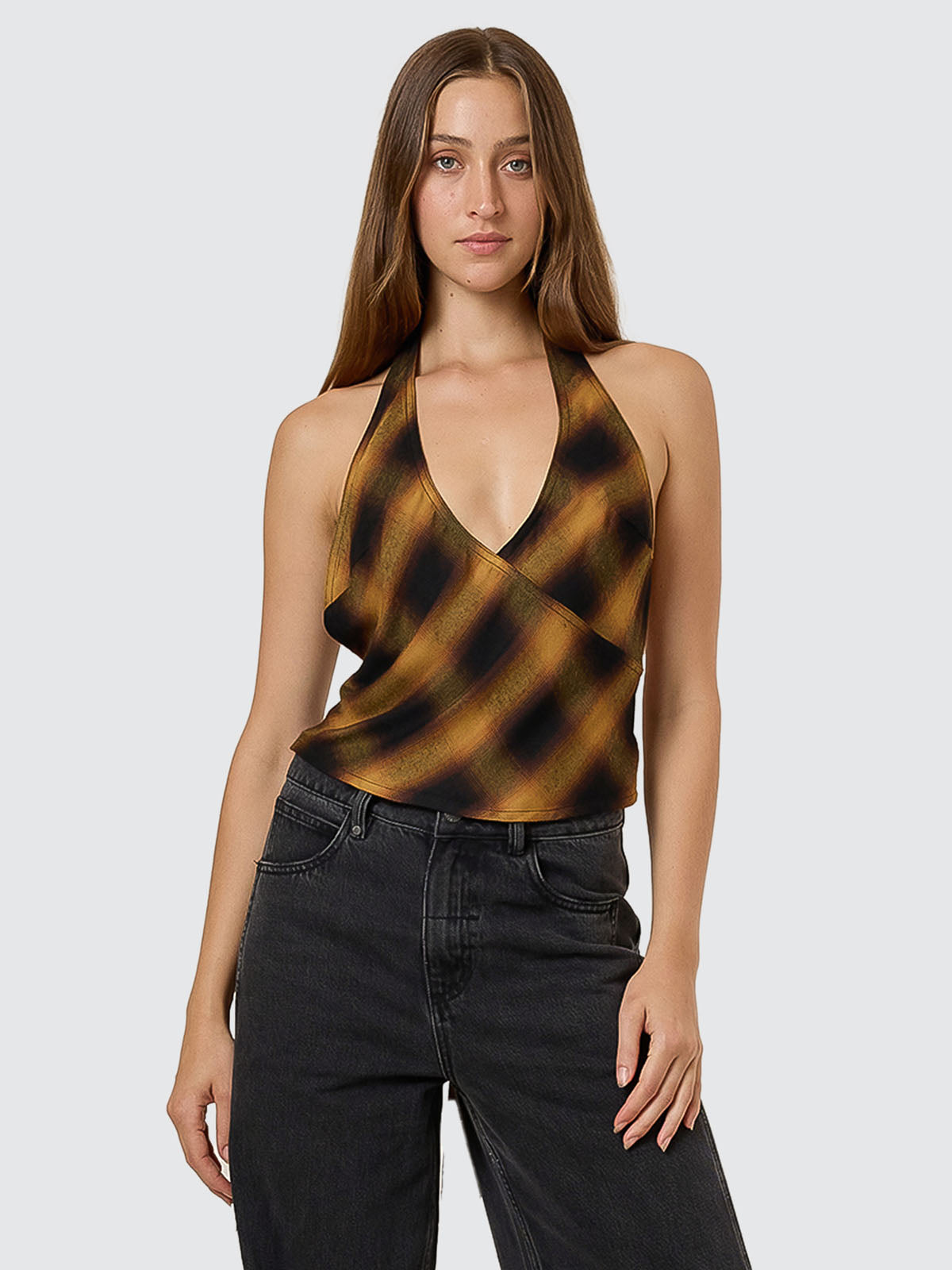 A classic pattern with a modern twist, the Lost Signal Halter Top in Bronze is made from soft rayon and cut with a plunging neckline, open back, and adjustable halter tie. The blurred, warm amber check delivers instant retro energy, making it a standout Australian women's clothing piece for layering, perfectly paired with our matching Lost Signal Skort for a complete ensemble, or women's linen pants for added texture.