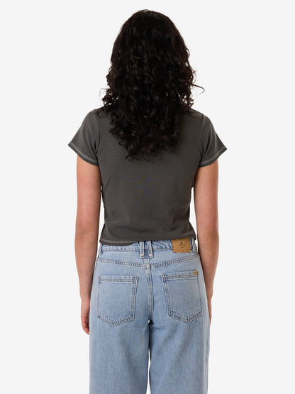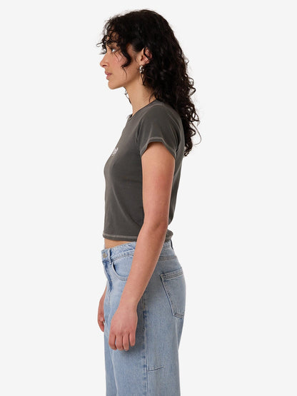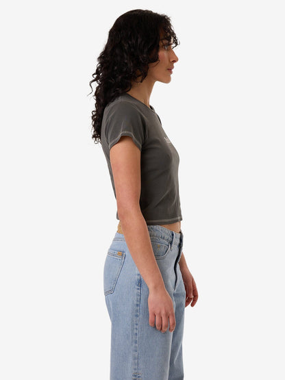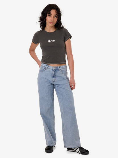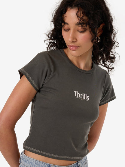 Slim-fitting and ultra-comfy, the Road To Paradise Mini Tee in Merch Black injects Y2K inspiration into your everyday style. Crafted from a premium cotton-elastane blend, it's soft and stretchy with a fine rib finish for a touch of sophistication. Perfect for pairing with baggy denim jeans, this fitted tee features a bold Thrills logo across the chest, a versatile cropped length and a flattering crew neckline.
